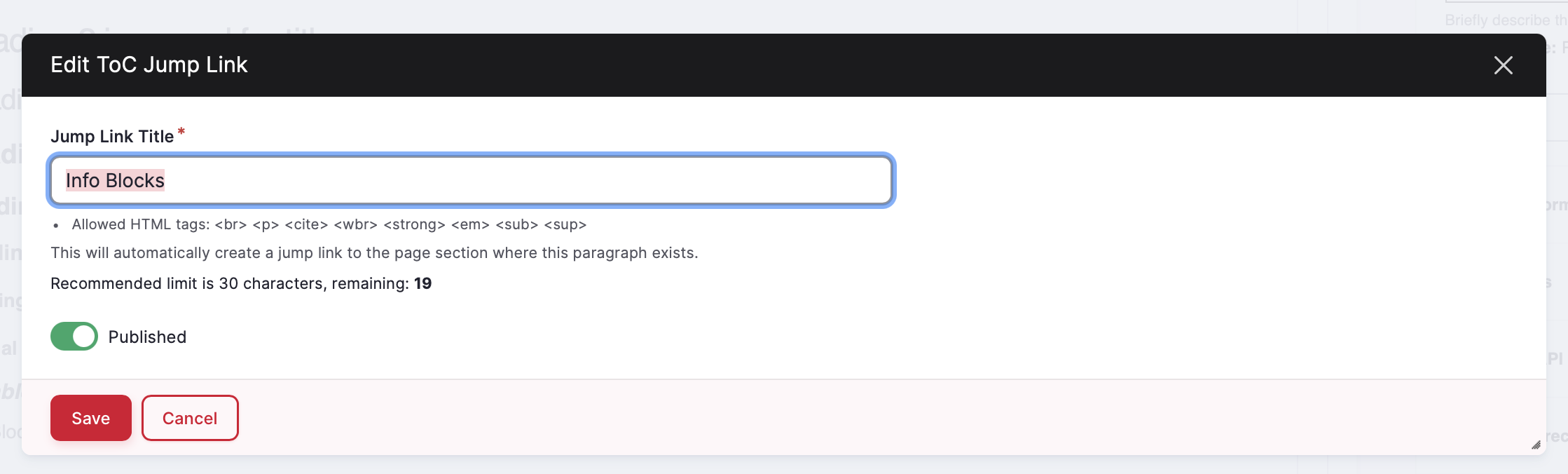 - When you add that component, you will also add the Jump Link Title. This is where you will add the word(s) that you want to display in the yellow TOC on page.