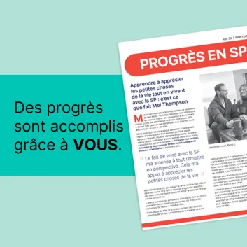 La collecte de fonds, le bénévolat et l’appui de nos activités de défense des droits et des intérêts ne sont que quelques exemples des possibilités qui s’offrent à vous pour apporter votre soutien aux personnes atteintes de SP et aux scientifiques qui consacrent leurs travaux à la recherche de nouveaux traitements novateurs contre cette maladie.